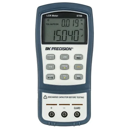 Banana to alligator test leads, 9V battery, mini USB interface cable, manual, AC adapter (879B only). 3. B ;K Precision 878B and 879B 40,000 Count Dual Display Handheld LCR Meters. B ;K Precision meter 878B ( ; 878-2189 878-2189 ) and 879B ( ; 878-2198 878-2198 ) are handheld LCR meters which measure inductance, capacitance and resistance quickly and precisely. The 879B can also calculate impedance, Theta and ESR. which is a feature typically found in bench LCR meters only. Measurement data can be continuously transferred to a PC using the mini USB interface. Featuring a tilt stand and dual display, it offers flexibility for viewing and operating, while an over-mold rubber case ensures durability in harsh industrial environments. Also includes banana to alligator test leads, 9V battery, mini USB interface cable, manual, and AC adapter. Features and Benefits:. 40,000 counts resolution on primary and 10,000 counts resolution on secondary display Automatic calculation of secondary parameters D, Q, O, ESR (O/ESR for 879B only) 0.5% basic accuracy Fast auto range design for rapid, easy component measurements Relative mode Data Hold and Min/Max/Average recording USB (Virtual COM) interface SCPI compliant commands for remote communication Selectable auto-power-off options