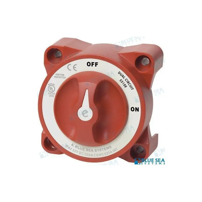 The Blue Sea double circuit battery disconnect switch is a fundamental element for electrical safety onboard any vessel, allowing quick and safe cutting or selecting of battery circuits.