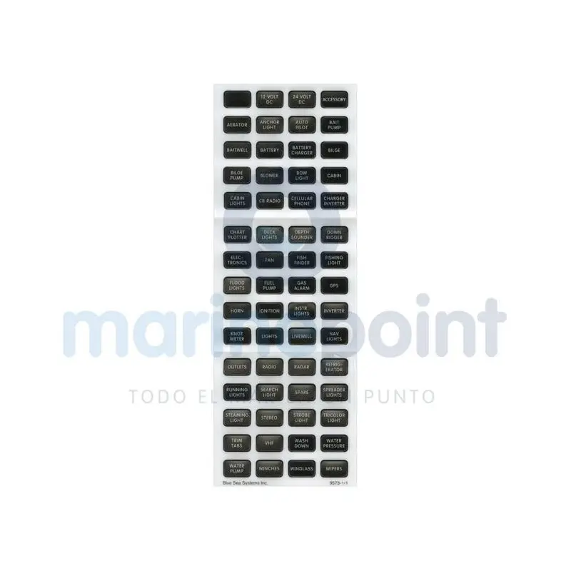 This set of adhesive labels is specially designed for Blue Sea electrical panels, allowing clear and durable identification of different switches and circuits. The black background ensures excellent visibility and a professional look on the vessel's electrical board.