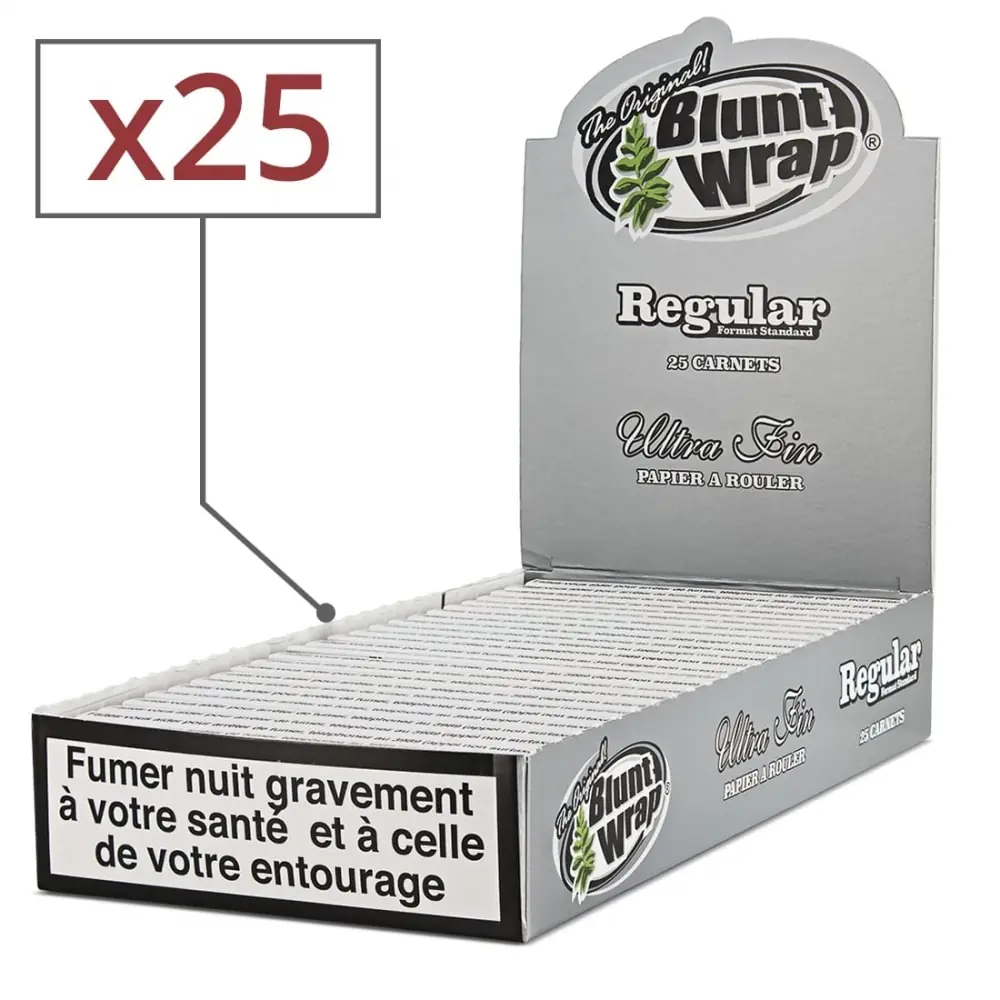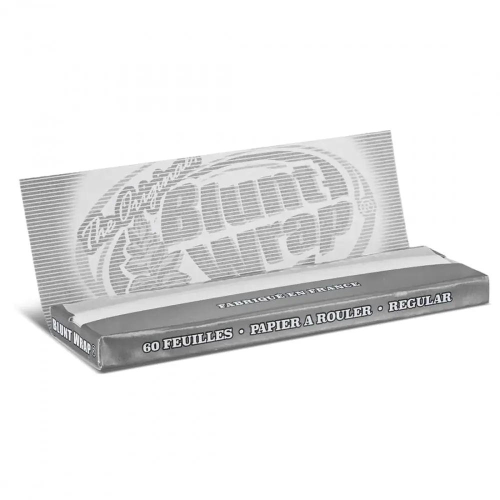 roll blunt wrap silver regular. each notebook contains 60 short sheets providing a total of 1500 sheets for extended use. with dimensions of 70 mm x 36 mm and an ultra-thin weight of 11 g/m² these sheets allow precise rolling. blunt wrap an iconic brand in the usa is recognized for its high quality products. these leaves made from natural hemp without additives preserve the purity of the aromas. natural acacia gum guarantees reliable adhesion without chemicals.