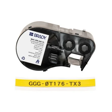 Create durable labels with the Brady BMP41/BMP51/BMP53/M511 printer, featuring high-quality black on yellow material.