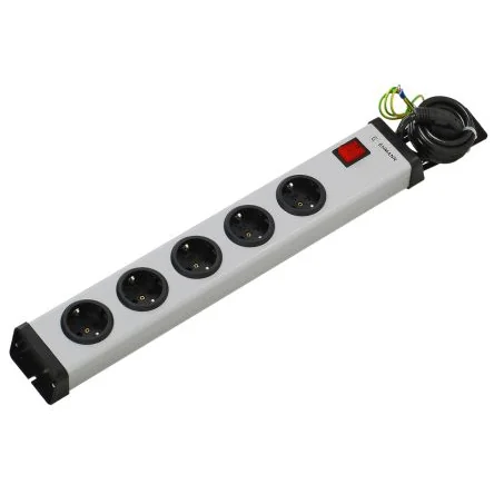 5. Bodo Ehmann Universal Socket Strip, 5 Way with Switch and Earth Conductor. Features and Benefits. Robust plastic, grey colour with black plastic end caps Built-in Type F German Schuko sockets (rotated 90°) Extra large space between sockets: 64 mm Illuminated 2-pole power switch 1.5 metre power cord terminated with a CEE 7/7 right angled plug Increased touch protection Extended protection with an additional external earth lead End caps with mounting facility Power cord: HO5VV-F 3G 1.5mm² Plug fitted: CEE 7/7 German Schuko / French Type E/F, angled Rated voltage: 250 V Rated power: 3600 W Rated current: 16 A