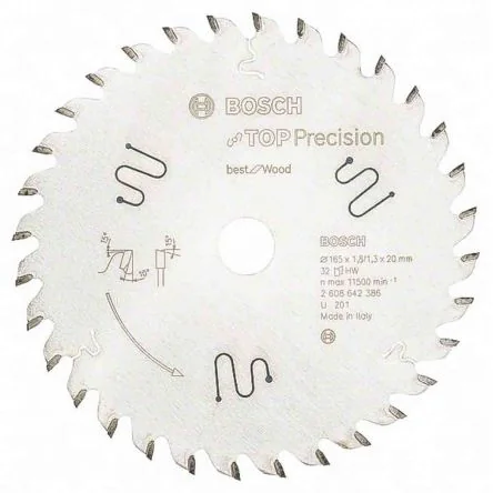 The Bosch 2608642386 optiline wood circular saw blade delivers precise quality cuts in all types of wood. Its high quality precision ground carbide 32 teeth enable clean cuts.Expansion slots lower vibration during use, which dampens noise and reduces heat development Compatible with hand-held, mitre, sliding mitre and table saws