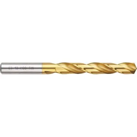 High-speed steel twist drill bit with Titanium Nitride coating for enhanced durability and precision.