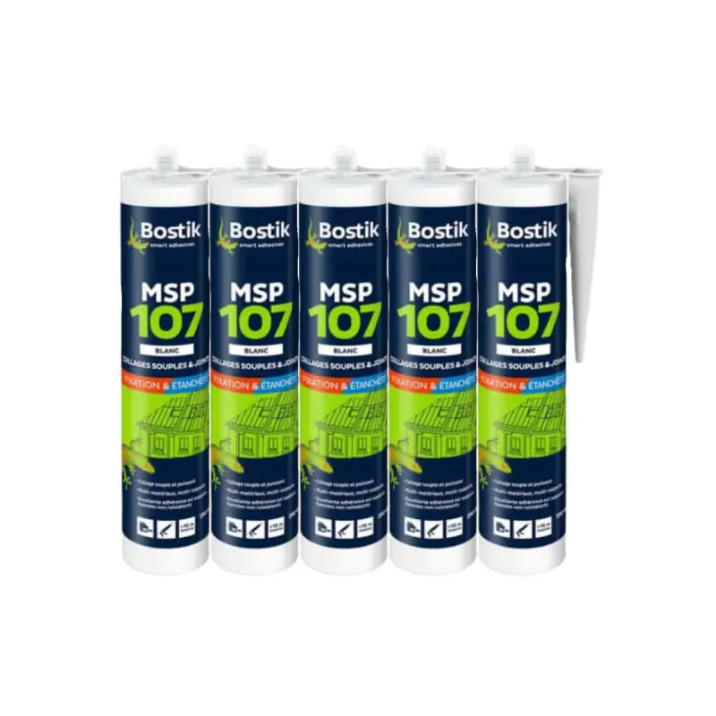 Bostik MSP 107 White Polymer Adhesive and Sealant for Wet Surfaces x5. Ideal for flexible bonding of elements that may be subjected to vibrations or shocks. Bonding of tiles, skirting boards, various decorative elements, pipes, and rainwater downpipes. And for expansion joints, contraction joints on concrete slabs, balconies, sealing under window sills, conservatories, and greenhouses. Sealing of masonry, partitions, wooden and metal frames, boats, caravans, and vehicle bodies.