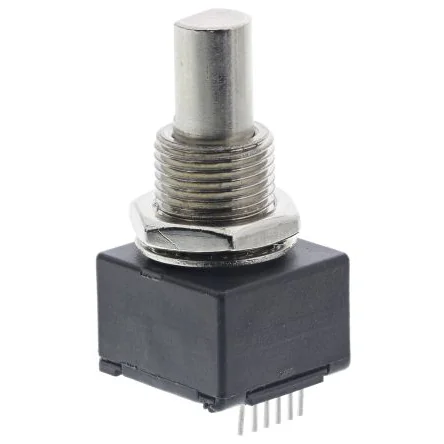EM14 Series 14 mm Rotary Optical Encoder w/Switch. EM14 series 14 mm rotary optical encoders with a compact package size, splashproof shaft seal, high rotational life cycle and HCMOS, CMOS and TTL compatability. These EM14 series rotary optical encoders are available with detent (stock number ; 789-9497 789-9497 ) and standard push switch (stock numbers ; 691-7695 691-7695 , ; 691-7692 691-7692 , ; 691-7705 691-7705 , ; 691-7709 691-7709 , ; 691-7718 691-7718 , ; 827 4997 827 4997 and ; 827-5007 827-5007 ) and have different shaft styles (please refer to datasheet for details). Typical applications for these EM14 rotary optical encoders are human/machine interface (HMI) applications. HCMOS, CMOS and TTL compatible High rotational cycle life Splashproof shaft seal Recommended for human/machine interface applications (HMI)