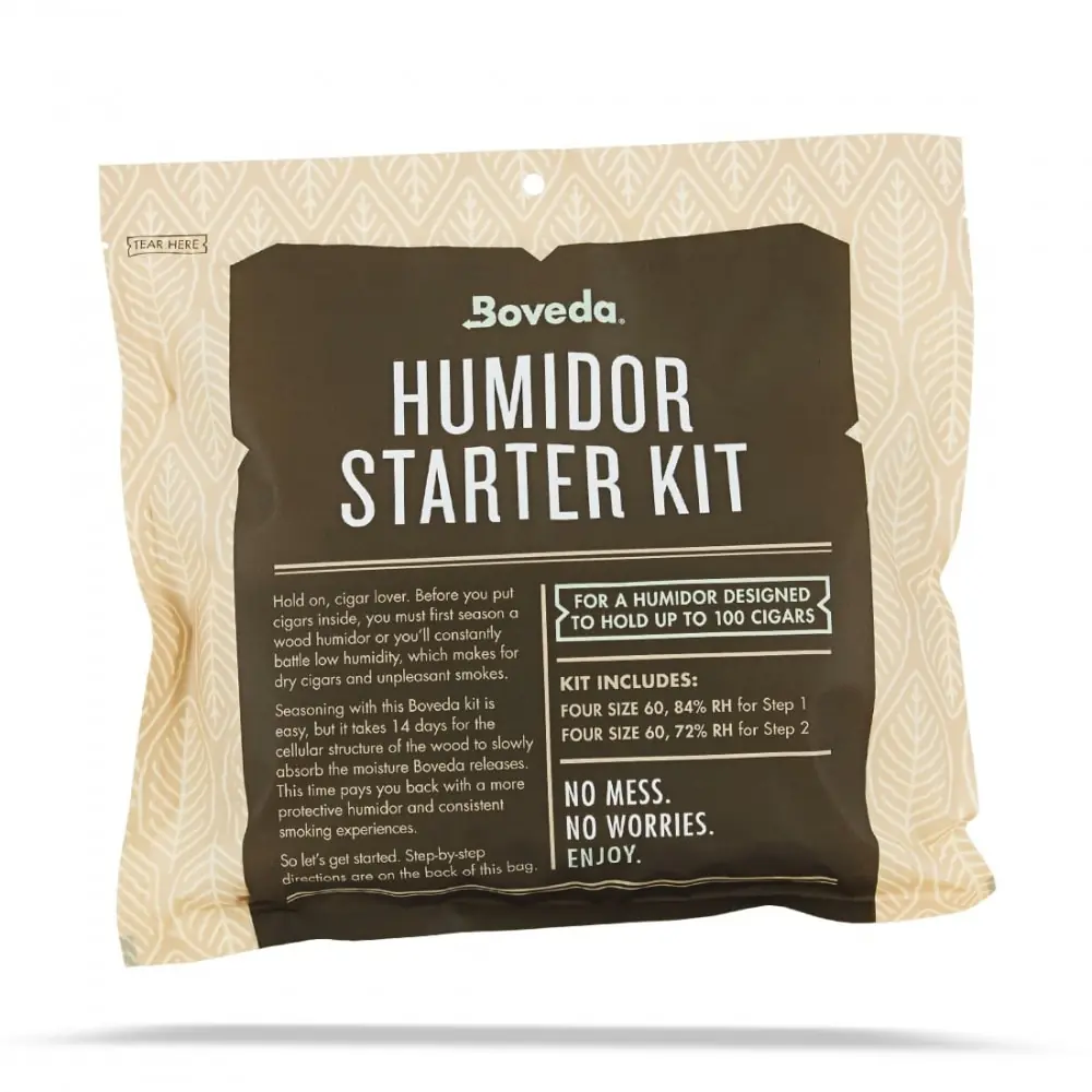 a wooden cigar humidor must be perfectly maintained with a humidifier to continue adding cigars to it and to be able to make the most of all the aromas of the modules that compose it. with the boveda starter kit for 100 cigars you can easily prepare your humidor for your cigar collection. in fact you will find in this kit everything you will need namely 4 humidifier sachets size 60 to 84% relative humidity (for stage 1) and 4 humidifier sachets size 60 to 72% relative humidity ( for step 2).