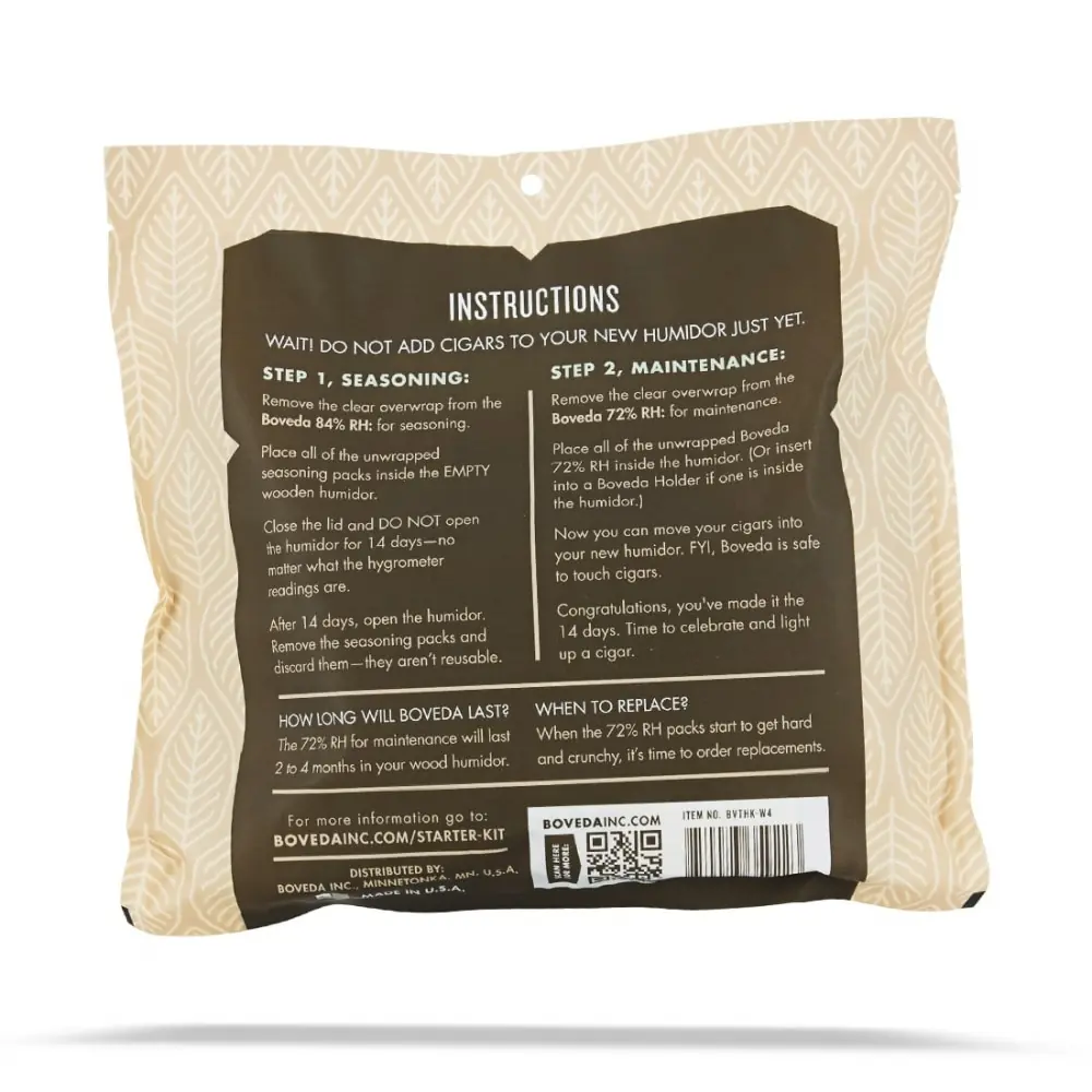 Boveda humidor starter kit (100 cigars) containing 4 boveda 84% humidifier sachets and 4 boveda 72% humidifier sachets.