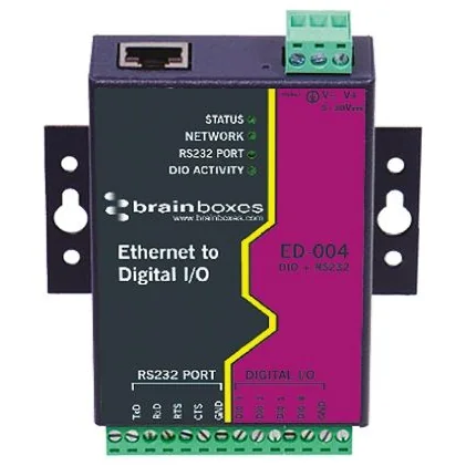 ED-004 - Converter Ethernet to Digital + RS232. The ED-004 is a converter from Industrial Ethernet to Digital I/O. 4 Digital Ports, Jumper selectable In or Out 1 RS232 Serial Port 1 Ethernet Port User friendly software interface Simple web based configuration, monitoring and control Legacy compatible Complete Ethernet to Serial Device Server Ethernet to DIO Device Server LED Status Indication 5 to 30 V Power Supply