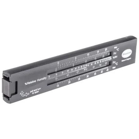 Whirling Hygrometer. Black, pocket size 2 piece hygrometer with blue spirit filled tubes scaled -5 to +50°C steps Provides relative humidity measurement in approximately 2 minutes Incorporates calculator scales for simplicity Spare tubes and wicks available