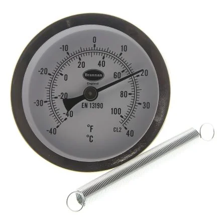 Brannan Clip On Pipe ThermometerThe Brannan clip-on pipe thermometer has a measuring range of -40°C to 40°C. This thermometer is designed to indicate the surface temperature of pipework. It has a steel case with a diameter of 63mm.Features and BenefitsStandard bi-metal coil sensor mechanism Chrome bezel material Surface contact type thermometer Spring connectionApplicationsBoiler pipework Radiators Process pipelinesCertificationsISO certified UKAS certified
