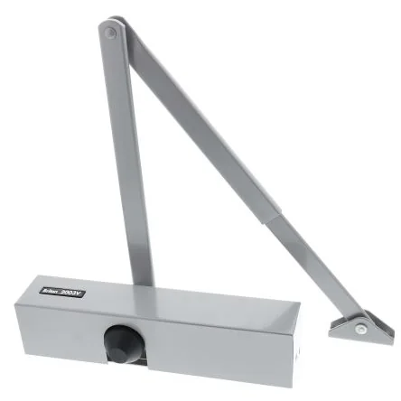 EN 1634, EN 1154, CE compliant. CF111. Universal Fixing Pack. 2003V Adjustable Door Closer. The adjustable power 2003V provides the flexibility to 'fine tune' the closing power of the door control in order to achieve the low 'opening forces' necessary to satisfy the requirements of Approved Document M of The Building Regulations and the guidance of BS 8300 in relation to the Disability Discrimination Act (DDA). It can be adjusted between power sizes 1 to 4, as shown in the 'Dimensions' table below. Cast aluminium body Stylish flatform arm in finish to match door closer cover Safety valve protected mechanism to prolong the life of the closer Fabricated cover conceals fixings and adjustment screws to reduce the risk of vandalism Forged, heat treated and ground steel piston for rugged durability Steel rack and pinion mechanism is heat treated for strength and durability Precision needle roller bearings for optimum performance and efficiency Suitable for left and right handed doors, supplied with universal fixing pack Fire tested to EN 1634, - 2 hours timber doors, 4 hours metal doors Maximum width 1100 mm Maximum weight 80kg Suitable for Transom, Regular and Parallel applications