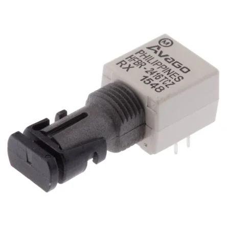 HFBR-14xxZ and HFBR-24xxZ Series Fibre Optic Components. Optical Receiver for Industrial Applications with Conductive ST-Threaded Port, RoHS Compliant. The HFBR-0400Z Series of components is designed to provide cost effective, high performance fiber optic communication links for industrial, power generation, power distribution, medical, transportation and gaming applications. The HFBR-24x2Z fiber optic receiver is designed to operate with the Broadcom HFBR-14x2Z and HFBR-14x4Z fiber optic transmitter up to 5MBd. This part is characterized with 50/125 µm, 62.5/125 µm, 100/140 µm, and 200 µm HCS® fiber optic cable. HFBR-24x2Z receiver incorporates an integrated photo IC containing a photodetector and dc amplifer driving an open-collector Schottky output transistor. This product is also available in other popular industry-standard connectors: SMA, SC and FC. Features. Low Cost Receiver Integrated Photo IC containing a photodetector and dc amplifier Data Rate up to 5MBd Link Distances up to 2km Specified with 50/125 µm, 62.5/125 µm, 100/140 µm, and 200 mm HCS Fiber Wide Operating Temperature Range -40C to +85C Unique Optical Port Design for Efficient Coupling Auto-Insertable and Wave Solderable No Board Mounting Hardware Required. Applications. Computer to Peripheral Links Computer Monitor Links Digital Cross Connect Links Modems and Multiplexers Suitable for Tempest Systems Industrial Control Links. Options:. HFBR-2412TCZ (Conductive ST-Threaded Port) HFBR-2412TZ (Plastic ST-Threaded Port) HFBR-2412Z (Plastic ST Port)