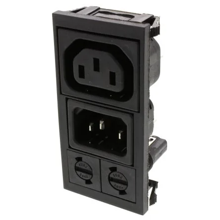 Neutral line must not be fused where it is referenced to earth. UL recognised component, CSA certified, VDE, SEMKO. These Plug / Socket Combinations and Adaptors have a current rating of 10A and a voltage rating of 250 Vac. 10A Snap In Fused Vertical 320 Plug / Socket Combination (C13/C14). Two integral 20mm fuse holders Fuse holders protected to PC2, IEC 127//6 250Vac 10A rated Panel cut-out 76·5 x 34·4 Panel thickness 1·0 to 3·0