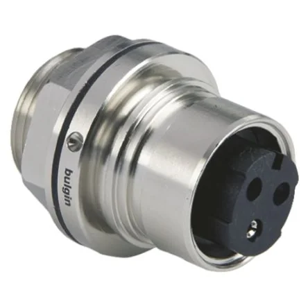 UL1977, IEC 61984:2009, CSA C22.2 No.182.3-M1987 (R2009), CCC GB/T11918 and GB/T11919. Mates with associated connectors: ; 765-9860 765-9860 and range. For sealing cap see stock number ; 765-9971 765-9971 For crimp contacts see stock number ; 765-9842 765-9842 and range, accessories see ; 765-9814 765-9814 and range. Bulgin Buccaneer, 6000 Series Panel Mount Circular Connectors, Metal. Bulgin Buccaneer, 6000 series panel connectors are robust waterproof harsh environment circular connectors suitable for a wide range of dust and water borne environments, with a durable nickel plated brass construction offering EMI protection and scoop proof connector contacts. These Bulgin Buccaneer metal bodied, panel mount circular connectors are suitable for signal and power applications and feature a push-pull secure, instant latching mechanism. Suitable for a wide range of harsh environment connector applications, such as industrial automation or food processing. One of the unique features of this range of connectors is that they are fully interchangable with the Bulgin Buccaneer 6000 series plastic circular connectors. These chassis mount circular connectors mate with flex cable connectors: PXM6010. Mates with Flex Cable connectors PXM6010 Front panel mounting Single hole fixing Pin or socket versions Leading earth on 3 pole connectors 2 and 3 pole screw terminals have contacts fitted, all others need to be ordered separately IP66, 68 and 69K rated when mated