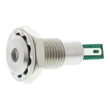 O-ring, fixing nut and shakeproof washer. LED Indicator, 12.1mm Mount, 12 / 24Vdc, Vandal Resistant. 5mm V-0 rated high contrast, frosted effect polycarbonate lens IP67 sealed 15mm low profile bezel, marine grade stainless steel housing Wide viewing angle Shock and vibration resistant Colour coded rear insulator 0.11 (2.8 x 0.8mm) terminals