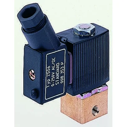 2 // 2 NF direct control, miniature solenoid valves, series 6011. Range of miniature, modular 2//2 solenoid valvesDirect control NF for neutral liquids up to +100°C. G1/8" threaded body connection. Able to change the solenoid without removing the valve. The solenoid can be positioned freely or locked in 4 positions at 90° intervals. High-quality, FPM sealing materials included as standard (Viton). DIN 43650C Connector Brass body.