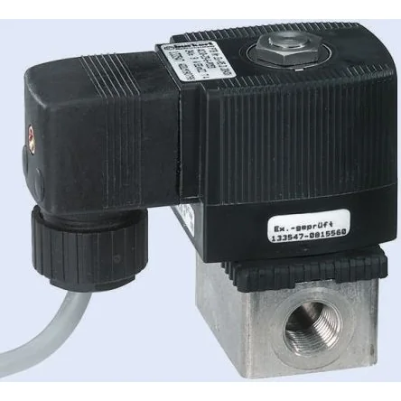 PTB 00 ATEX 2129X. II 2 G EEx m IIT4. 2/2 way Compact, Type 6013Ex. The direct-acting 2/2-way, normally closed type 6013Ex solenoid valve is suitable for use with neutral and aggressive gases and fluids, for example: compressed air, town and natural gas, water, and hydraulic oil, in filling, dosing, and batching applications. The coil orientation can be varied through 360° to facilitate wiring. Installation of the 2/2 way solenoid valve is preferable with the coil uppermost. The moulded-in cable included is 3m in length, and the unit offers an Ingress Protection rating of IP65. The 2/2 solenoid valve can accommodate fluid with a maximum viscosity of 21mm²/s