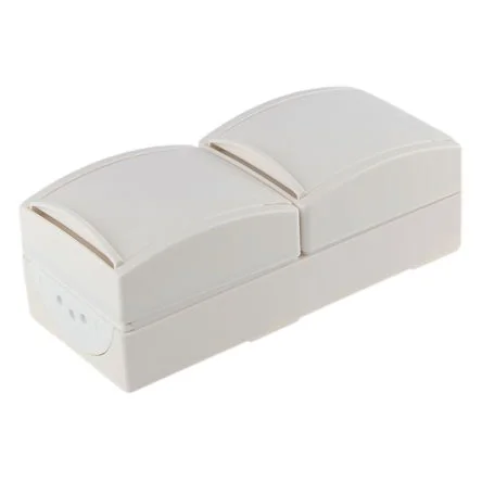 Durable outdoor 2 gang Schuko socket with IP44 rating for reliable performance in wet environments.