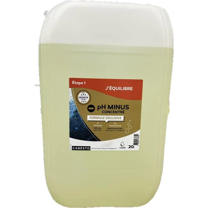 PH MINUS LIQUIDE CONCENTRE 20L is a highly effective acidic liquid designed to lower the pH levels of swimming pool water, thereby enhancing water quality and optimizing the performance of disinfection products. Its exclusive formula combines hydrochloric and sulfuric acids, facilitating efficient pH reduction, especially when used with automatic regulation devices.