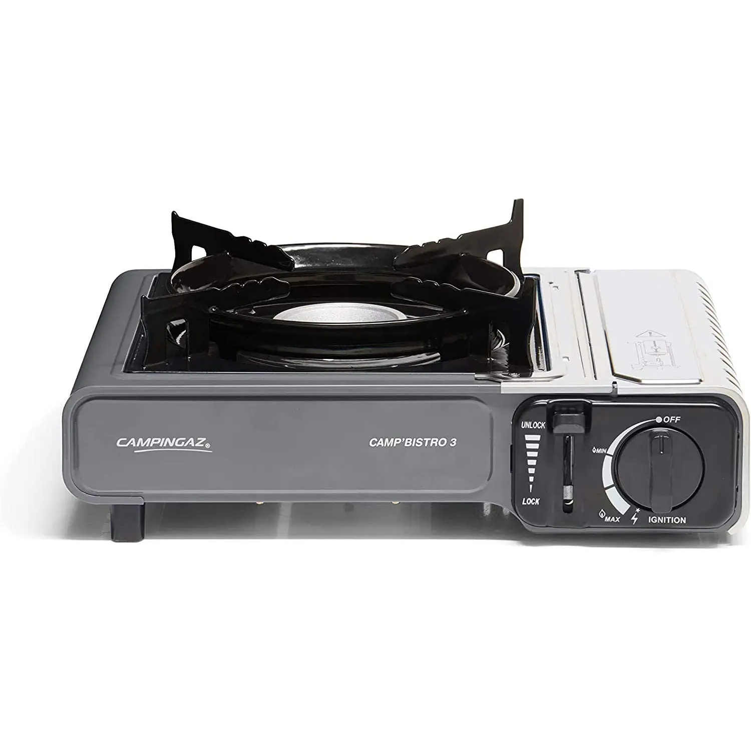 The Campingaz Camp'Bistro™ 3 is a compact and powerful single-burner camping stove designed for outdoor cooking. It features a 2,200W burner for quick boiling times and operates on Campingaz® CP 250 gas cartridges, providing a runtime of up to 1 hour and 20 minutes per cartridge. The stove includes a piezo ignition system for safe, match-free lighting and a cartridge safety locking system that cuts off gas flow and ejects the cartridge when not in use. The pan support is elevated and fixed in place to prevent larger pans from overheating the gas compartment. The stove is delivered in a hard plastic carry case for easy transport and storage.