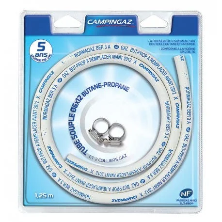 The Campingaz Flexible Hose Collar 1.25m is designed for connecting low-pressure gas appliances, such as barbecues, to gas cylinders. This hose assembly ensures a secure and compliant connection, adhering to relevant safety standards.