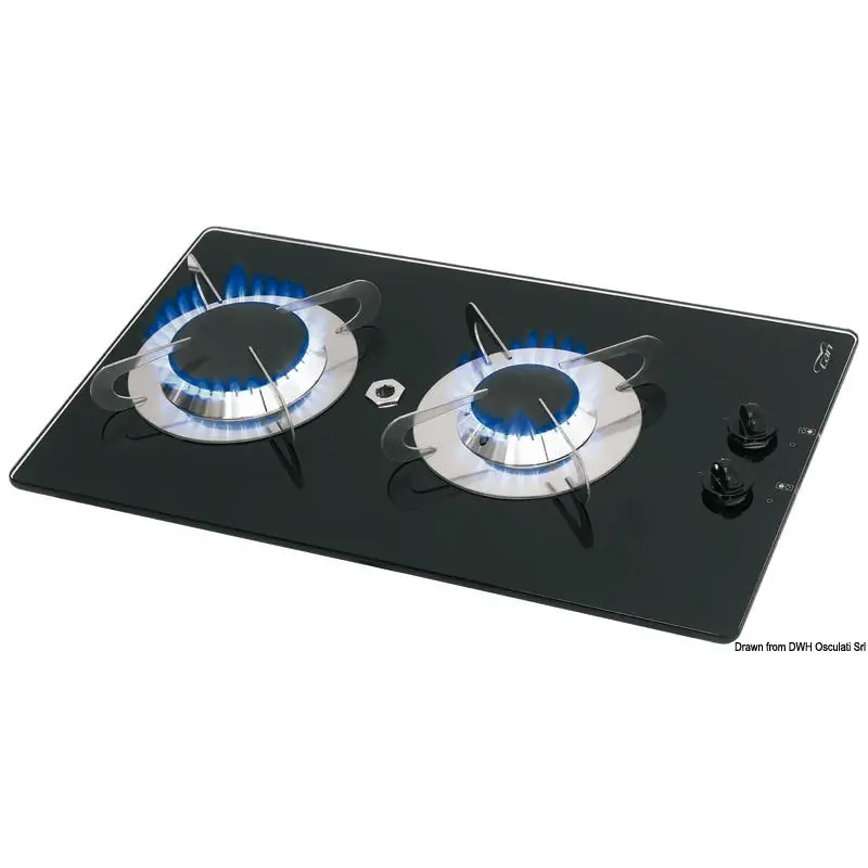 The Burny Cristal from CAN is a built-in 2-burner gas stove with a black tempered glass cooking surface, designed for the fitting of vans, camper vans, motorhomes, and boats.