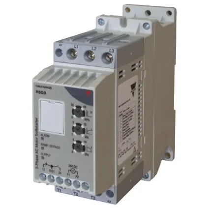 RSGD - Soft Starter, Three Phase. RSGD is an extremely compact and easy to use 3-phase soft starter for AC induction motors. RSGD controls two phases and is internally bypassed to reduce the heat dissipation inside the panel. Through its micro-controller based algorithm, the RSGD achieves an exceptional inrush current reduction resulting in smoother starting and stopping of motors. The starting parameters can be easily set-up through a 3- knob user interface and LED indications are provided for indication of supply, alarm and ramping/ bypass status. RSGD provides a number of diagnostic functions including phase sequence, over- and under-voltage monitoring and locked rotor protection. Soft starting and soft-stopping of 3-phase squirrel cage motors 45mm wide, IP20 housing Operational Voltage: RSGD40 (220 - 400V) 2-phase controlled Integrated bypass relays