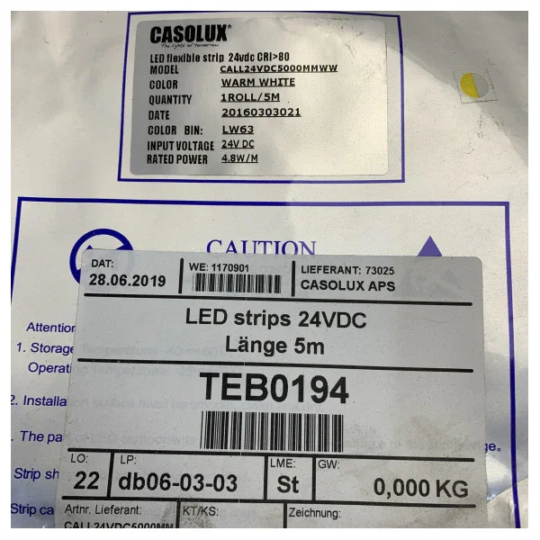 This Casolux LED strip has the product code CALL24VDC5000MM and is designed to work directly on a 24V DC power source. The total length is 5 meters, which corresponds to 5000 millimeters. The light colour is Warm White, providing a light output with a colour temperature of approximately 3000 Kelvin. The strip has a certain degree of waterproofing, ideal for humid environments.