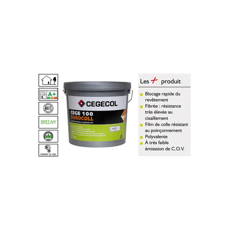 The special fibrated acrylic adhesive LVT CEGECOL Cege 100 Durocoll is an adhesive specially developed for bonding interior floor coverings in P2 or P3 premises. It is suitable for bonding LVT in planks and tiles, as well as rubber and linoleum. This adhesive can be applied to most substrates and is very easy to use.