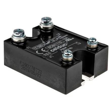 Single-phase synchronous solid state power relay. Range of SMD hybrid technology synchronous solid state power relays (close at 0 voltage, open at 0 current: resistive load), low leakage current, silent and with unlimited number of operations. Applications: furnaces, extruders, presses, heating, motor control, solenoids, brakes, home automation, etc. Radiators, safety hood and DIN rail available separately.