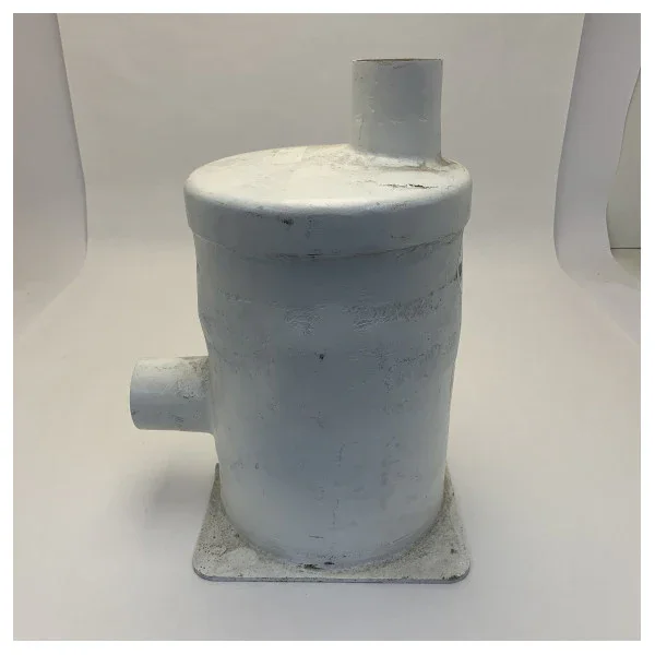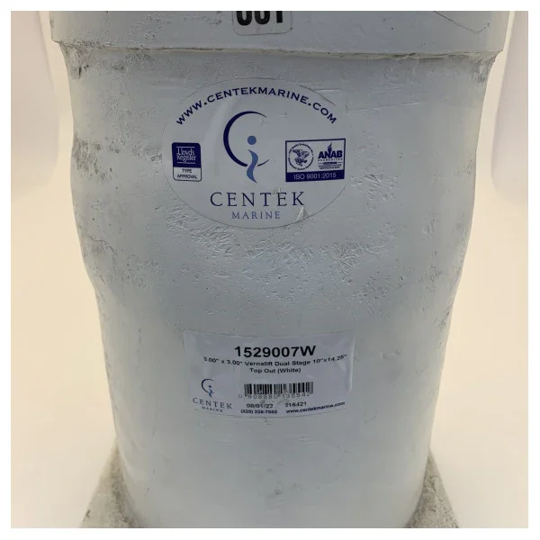 This Centek exhaust silencer, with product number 1529007, is equipped with connections of 76 mm (3 inches) in diameter. The silencer is specifically designed as a Vernalift Dual Stage model. The material is a high-quality composite that withstands the marine environment. The dimensions and precise flow are optimized for effective dampening and water drainage, which is essential for protecting your engine.