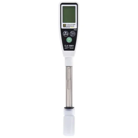 The C.A 10001 tester can be used with a buffer solution for calibration to obtain the pH value with only 2 clicks. The C.A 10001 can be used in a wide range of sectors involving electrochemistry, such as hydroponics, swimming pools, spas, education, water treatment, drinking water, aquariums, beverages industry, use in the field, cosmetics and chemistry laboratories, etc. The C.A 10001 comes in the form of a pen equipped at one end with a combination electrode 12 cm long with a built-in temperature sensor. The wide multi-parameter screen simultaneously displays the pH and temperature values (°C or °F). The ATC (Automatic Temperature Compensation) mode automatically displays the pH value compensated for temperature. Calibration is automatic (up to 3 points), requiring single press on the CAL key.