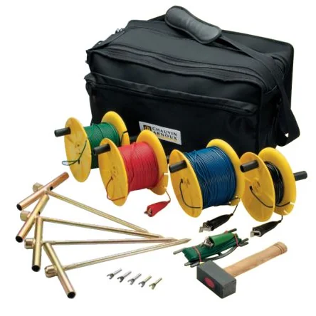 Comprehensive earth tester kit with essential accessories for accurate ground resistance testing.