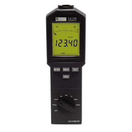 Carrying case, 1 FRB F connector, 1 x 9 V battery, 1 set of 15 reflective films (0.1 m length), operating manual, TACHOGRAPH CD-ROM software (CA1727) and a quick start guide. Industrial tachometers. Tachometers that provide excellent legibility, intended for numerous functions and measurements: rotation speed, linear speed, count, frequency and period. 7 different units (rpm, m/min, Hz, ms, Duty%, ft/min) MIN/MAX and HOLD functions SMOOTH function (calculates a rolling average of the 10 most recent measurements) Counter function (CA1727 only) Two-level alarm function (CA1727 only) Data saving and analysis with USB connection and TACHOGRAPH software (CA1727 only)