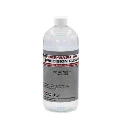The Chemtronics FOCCUS Fiber-Wash AQ Precision Fiber Optic Cleaning Liquid contains a non-flammable, water-based cleaning solution that quickly and safely cleans the end face of fibber optic connectors, splices and ribbons. It also dissipates static charge, which prevents attracting airborne contamination that cling to the end face surface. The cleaning formulation has low odour, is plastic safe, and residue free. Because it is water based, it has the environmental benefits of low VOC and GWP (Global Warming Potential). This non-pressurized container can be easily and safely transported. For best results, use with the QbE Cleaning Platform or CCT Clear Connection Tool and the Combination Cleaning process.Non-flammable aqueous cleaner Removes a broad range of soils: dust, oils, soils, complex soils, salts and other contaminants Residue free, low VOC, low global warming potential (GWP) Portable and easily transportable Cleans connectors with QbE Cleaning Platform or with CCT Clear Connection Tool Dissipates static charge which can attract airborne contaminants Plastic safe and compatible for all fibber optic connectors