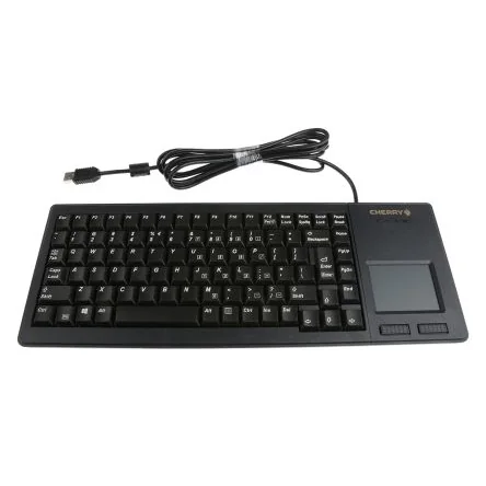 Cherry XS Touchpad Keyboard G84-5500. Small, flat and extremely robust the Cherry "XS Touchpad Keyboard" (G84-5500) combines comfortable mouse control with compact dimensions. The mouse can be controlled easily and precisely via the large touchpad with two mouse keys. High-quality touchpad with two mouse buttons for convenient control of the cursor High degree of reliability and precise keystroke feel thanks to individual keys with Gold Crosspoint contacts Key technology: ML Long operating life in excess of 20 million key confirmations per individual key Compact dimensions:374x139x18mm Ideal for19" applications Lightweight Plug and Play Supports Code Set 3 and UnifiedPOS Fastening option for permanent installation Detachable pluggable feet for individually adjusting the tilt of the keyboard Freely programmable keys for even more time-saving operation Cable Length: approx. 2.5m