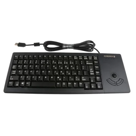 Cherry XS Trackball Keyboard G84-5400. The Cherry "XS Trackball Keyboard" (G84-5400) combines comfortable mouse control with compact dimensions. Via the optical trackball with two mouse keys, the cursor can be controlled easily and precisely. Optical trackball with two mouse buttons for easy control of the cursor High degree of reliability and precise keystroke feel thanks to individual keys with Gold Crosspoint contacts Long operating life in excess of 20 million key confirmations per individual key Compact dimensions:374x139x20mm Ideal for19" applications Lightweight Plug and Play Supports Code Set 3 and UnifiedPOS Fastening option for permanent installation Detachable pluggable feet for individually adjusting the tilt of the keyboard Freely programmable keys for even more time-saving operation Cable Length: approx. 2.5m