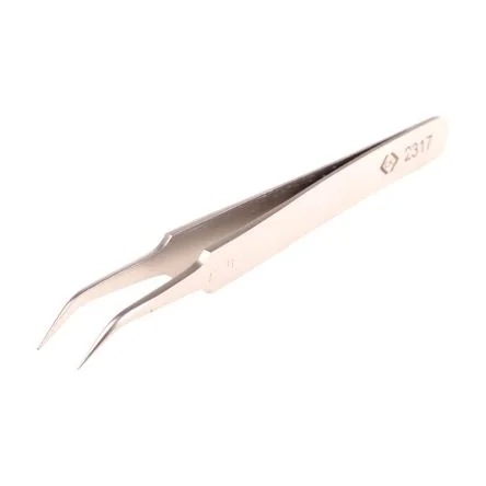 Curved tweezers for surface mounted components. The curved ends provide an optimum view. Also used to handle SMT housings. Made from non-magnetic, acid-resistant stainless steel.