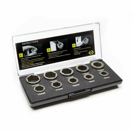 The CK Tools patented extractor inserts for Ring Spanners & Sockets is adapters for fixings sized and securely grips all round and works on fasteners with up to 85% damaged or worn corners.Securely grips all round and works on fasteners with up to 85 % damaged or worn corners Works on a range of fasteners e.g. 6-point, 12-point, Hex, Spline Adapts just two Socketes/Ring spanners sizes to fit 10 different fasteners (sizes 8-17 mm) 8-12 mm Inserts suit 14 mm Wrench 12-17 mm Inserts suit 19 mm Wrench Unique flange design to prevent fall through Adapters for fixings sized 8, 9, 10, 11, 12, 13, 14, 15, 16 and 17 mm