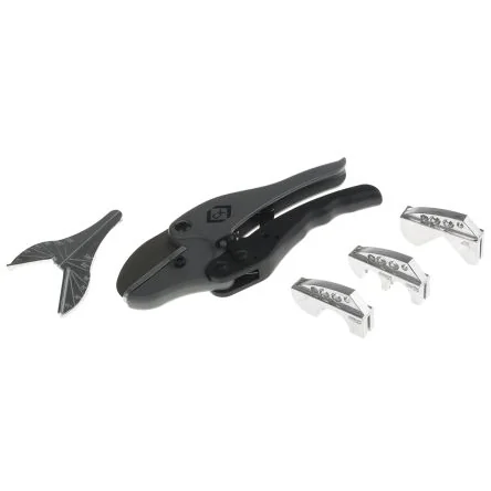 5 interchangeable anvils: low profile style, double radius, single radius, 90° and multi-angle. Multi pipe cutters. For cutting hoses, PVC pipes, mouldings, trim and wall plugs Easy cutting via ratchet mechanism Not suitable for cables, sheet metals or similar metal products Extra-sharp forged stainless steel blade Aluminium anvils and handles Anvils are easy to replace Replacement blades available separately, see stock no. ; 669-4579 669-4579