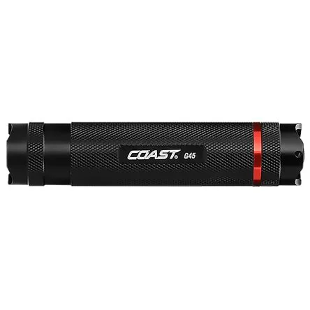 Coast G45 LED Torch. The Coast G45 LED torch combines bright light, compact size and low cost. The Max Beam Optic System with six LEDs project a wide, flood beam illuminating the darkest of areas. Powered by 3 x AAA alkaline batteries the G45 has an impressive run time of 8 1/2 hours. The lightweight aircraft grade Aluminium casing offers great durability, holding up to heavy daily use. The G45 is impact and weather resistant with the LED being virtually unbreakable. Features and Benefits. Compact and lightweight. Aluminium body. Impact and weather resistant. Weight: 100 g (including batteries). Powered by 2 x AAA alkaline batteries