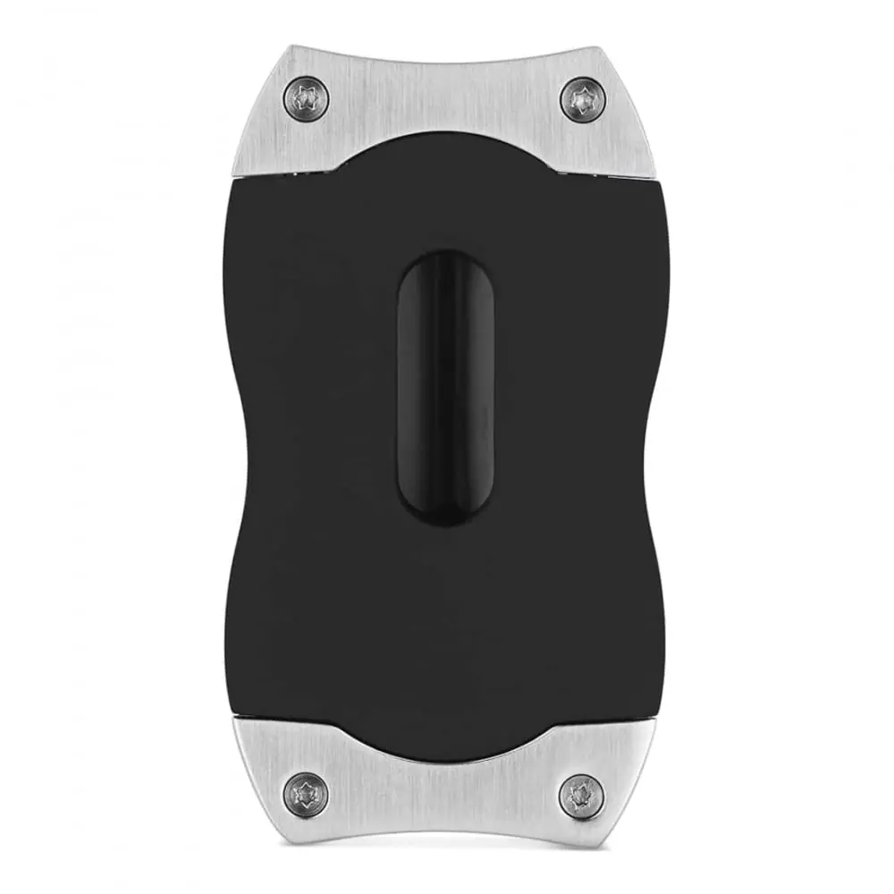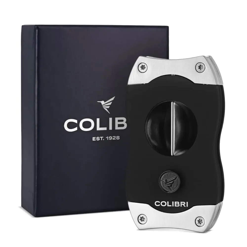 metal and stainless steel cigar cutter in black and brushed chrome. it allows you to cut the head of the cigar with a "v" shape to release all the aromas while preserving its wrapper. the opening is done via a push button representing the logo of the colibri brand.