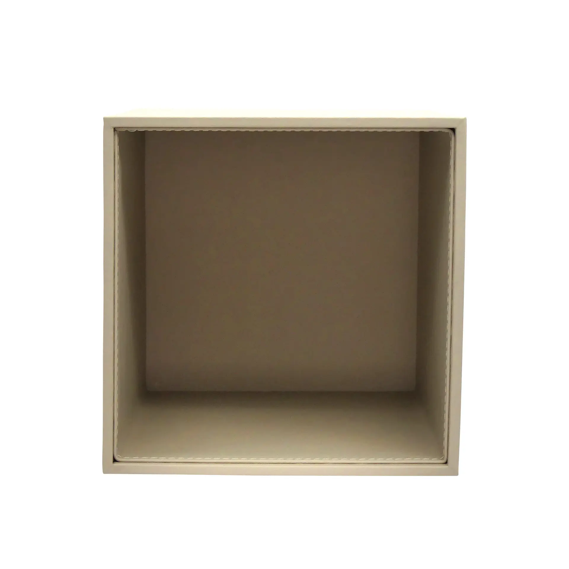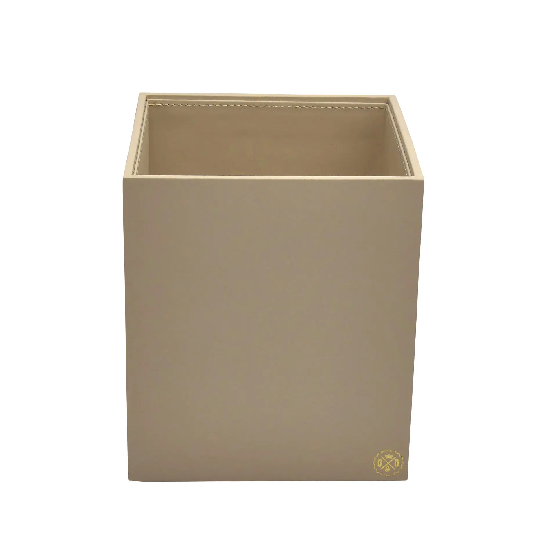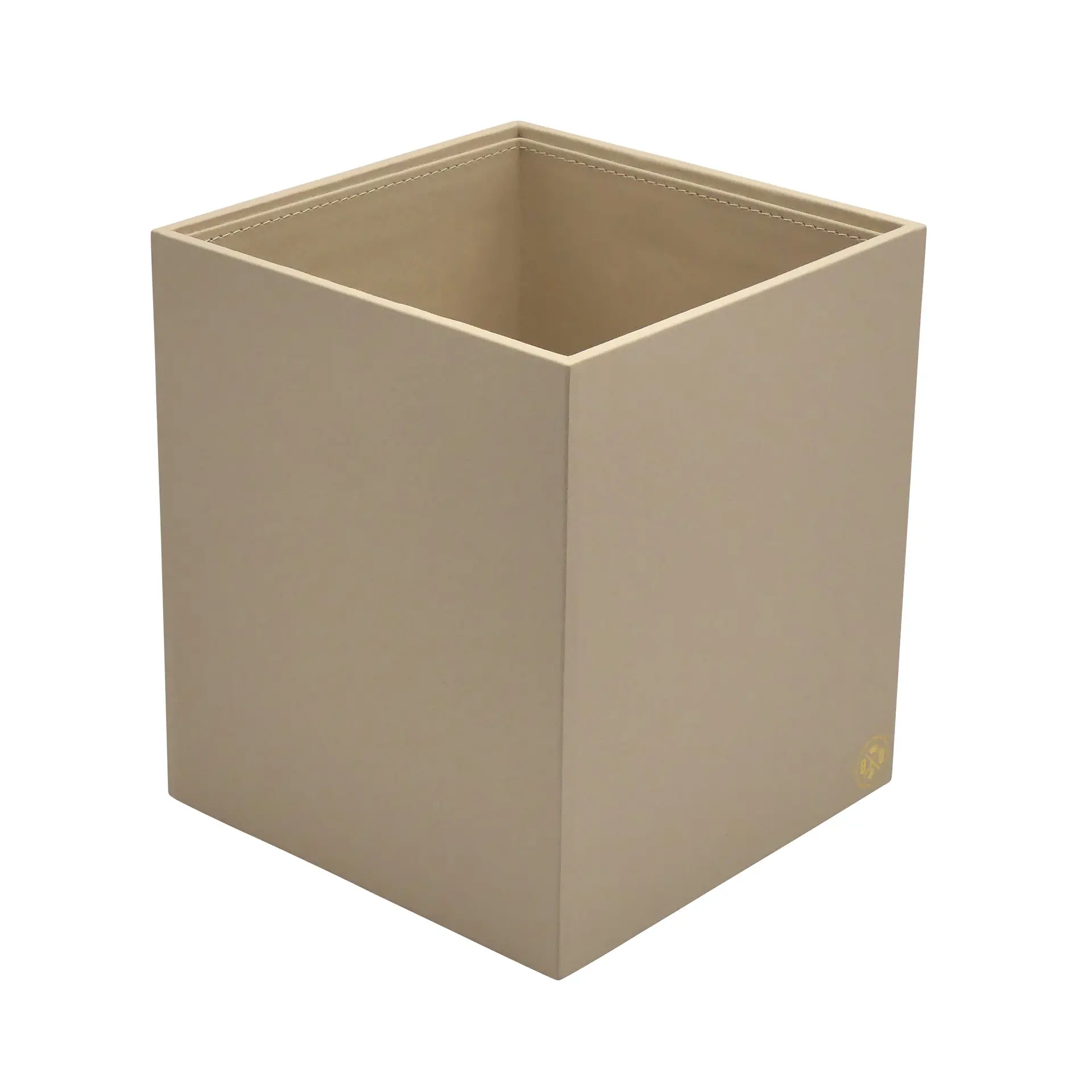 Elegant beige leather wastepaper basket, perfect for office decor.