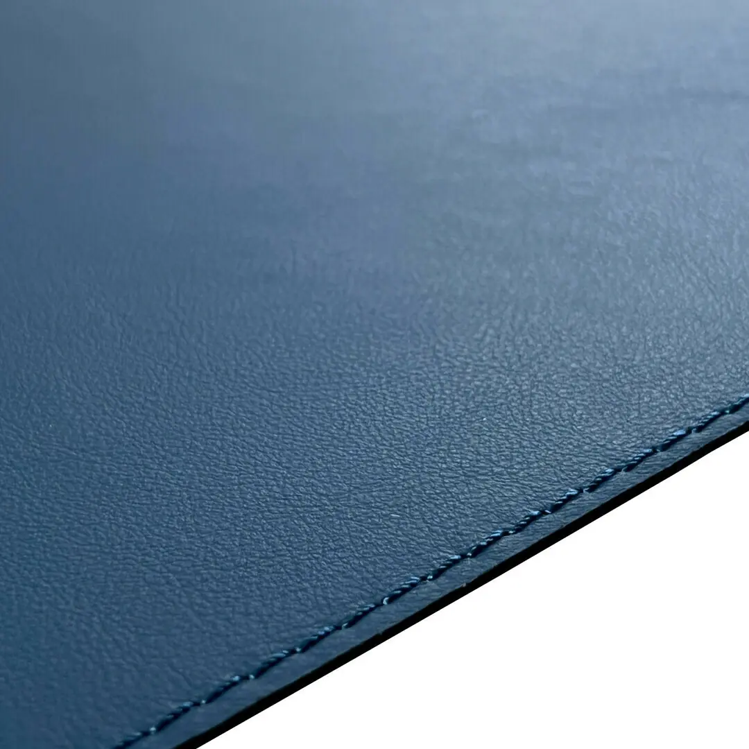 Elegant blue leather desk pad in medium size, perfect for a stylish office setup.