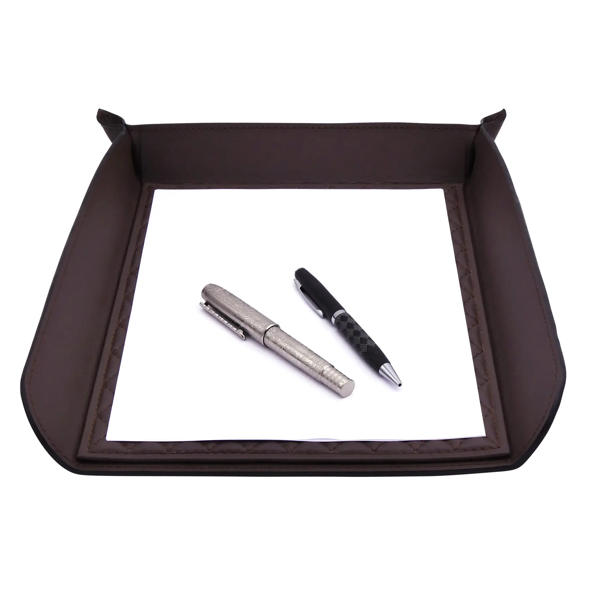 Elegant A4 leather letter tray with diamond stitching, crafted in France for a stylish office organization.