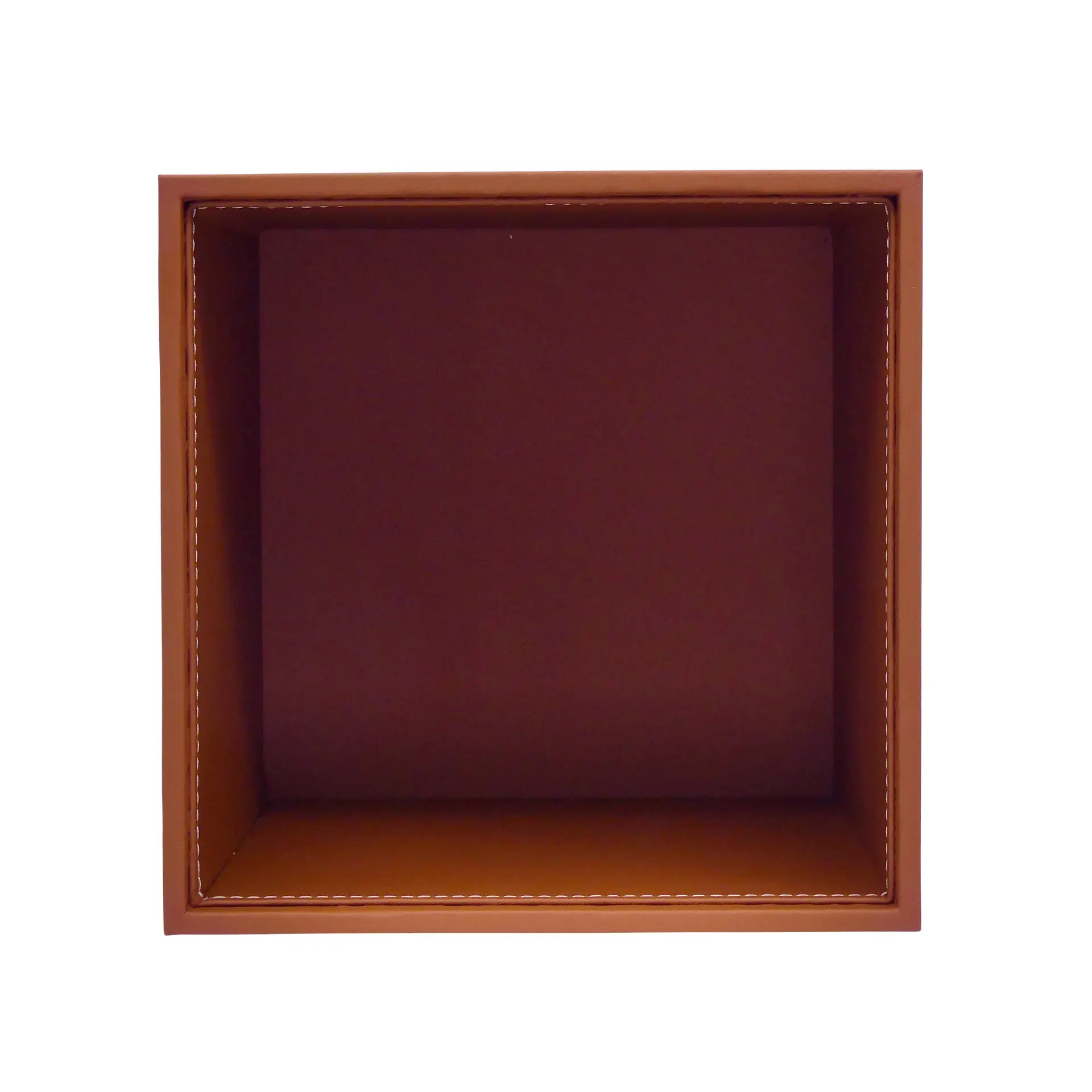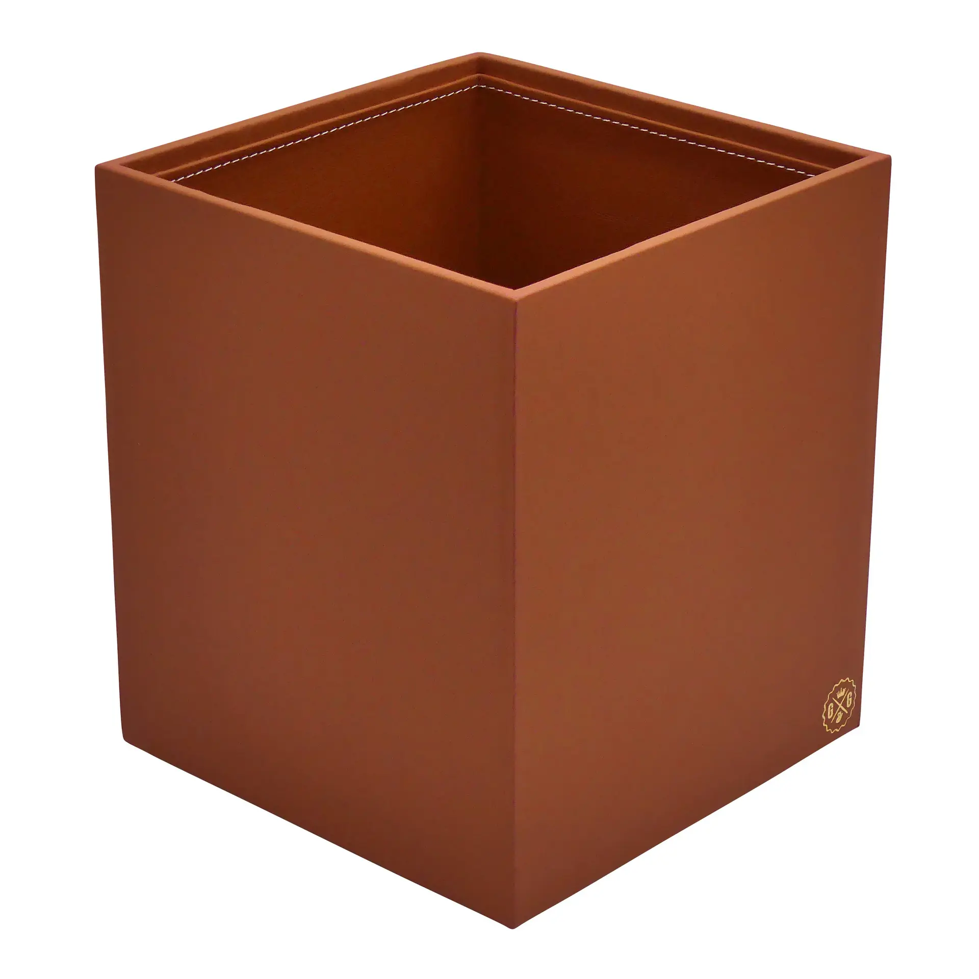 Elegant light brown leather wastepaper basket, perfect for office decor.