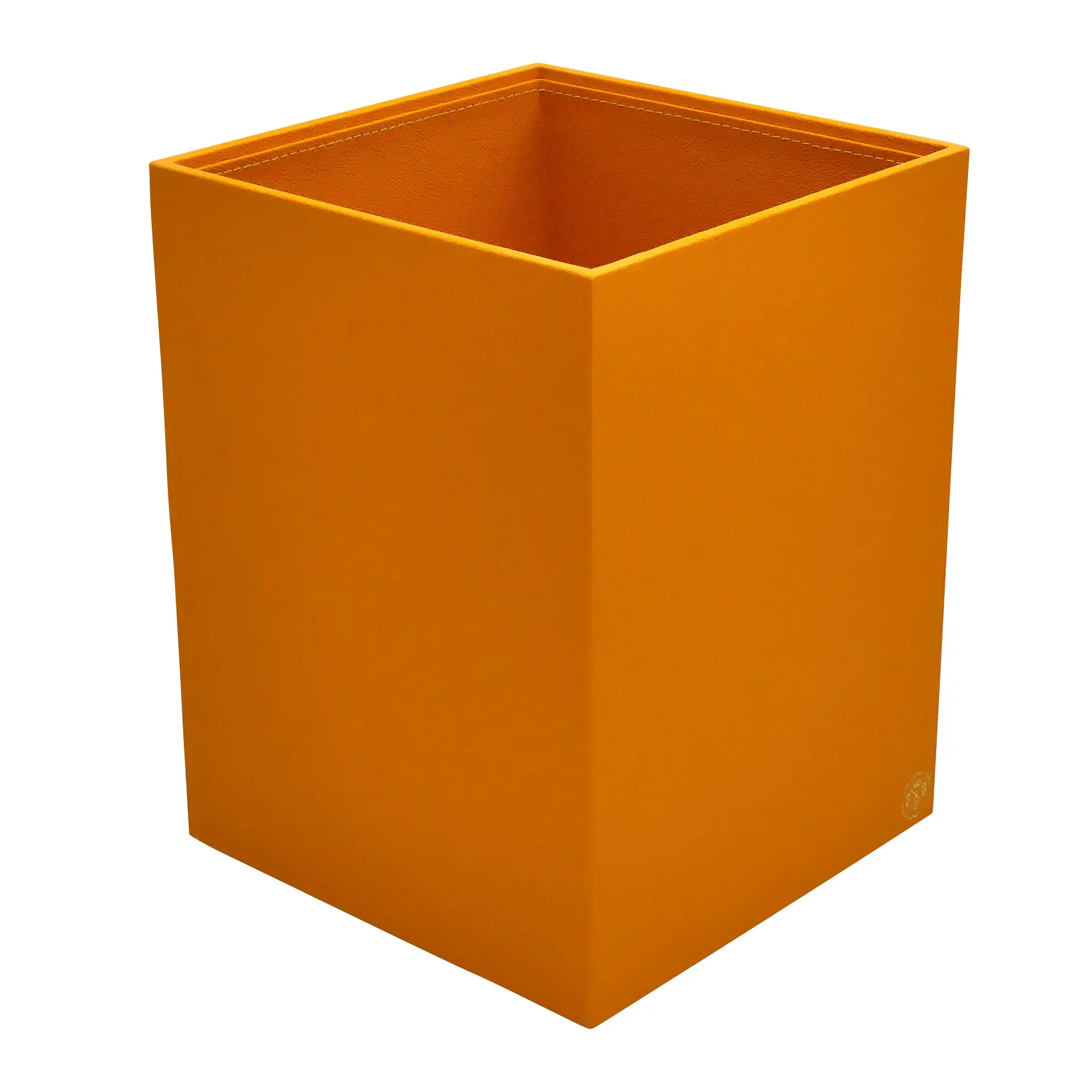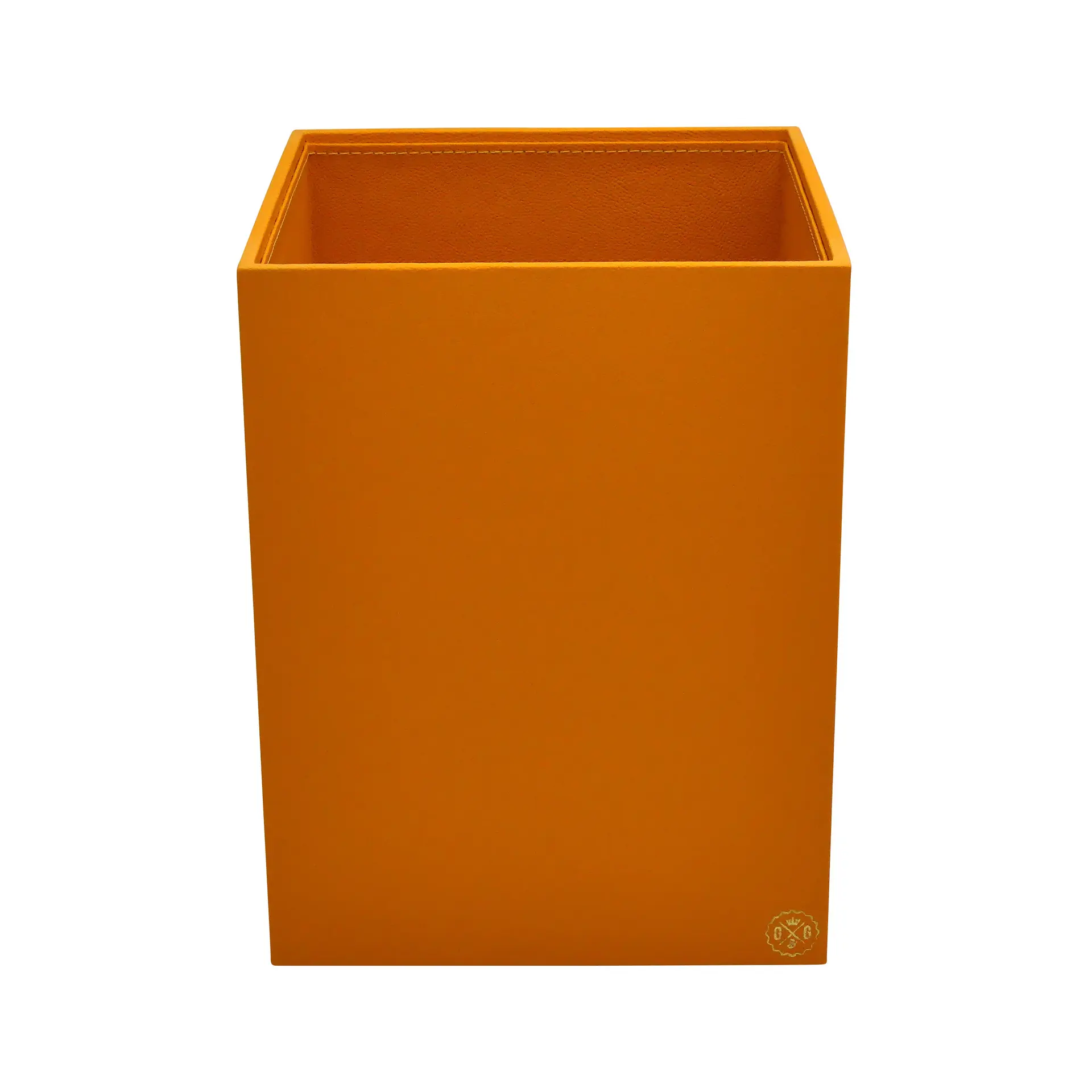 Elegant orange leather wastepaper basket, perfect for stylish office decor.