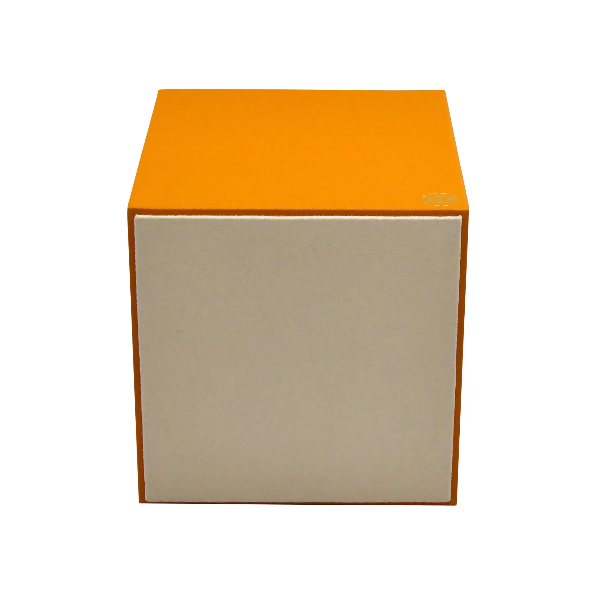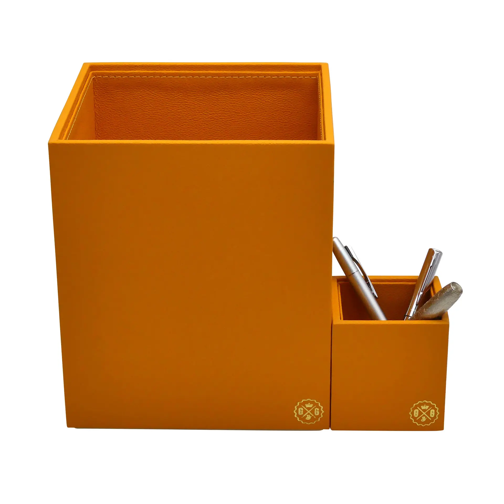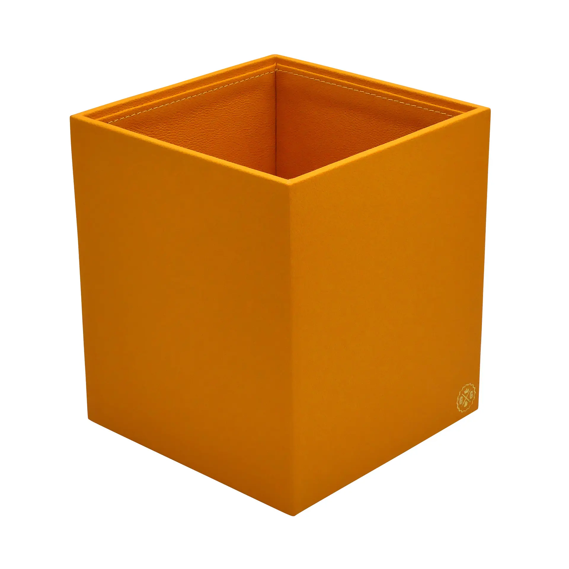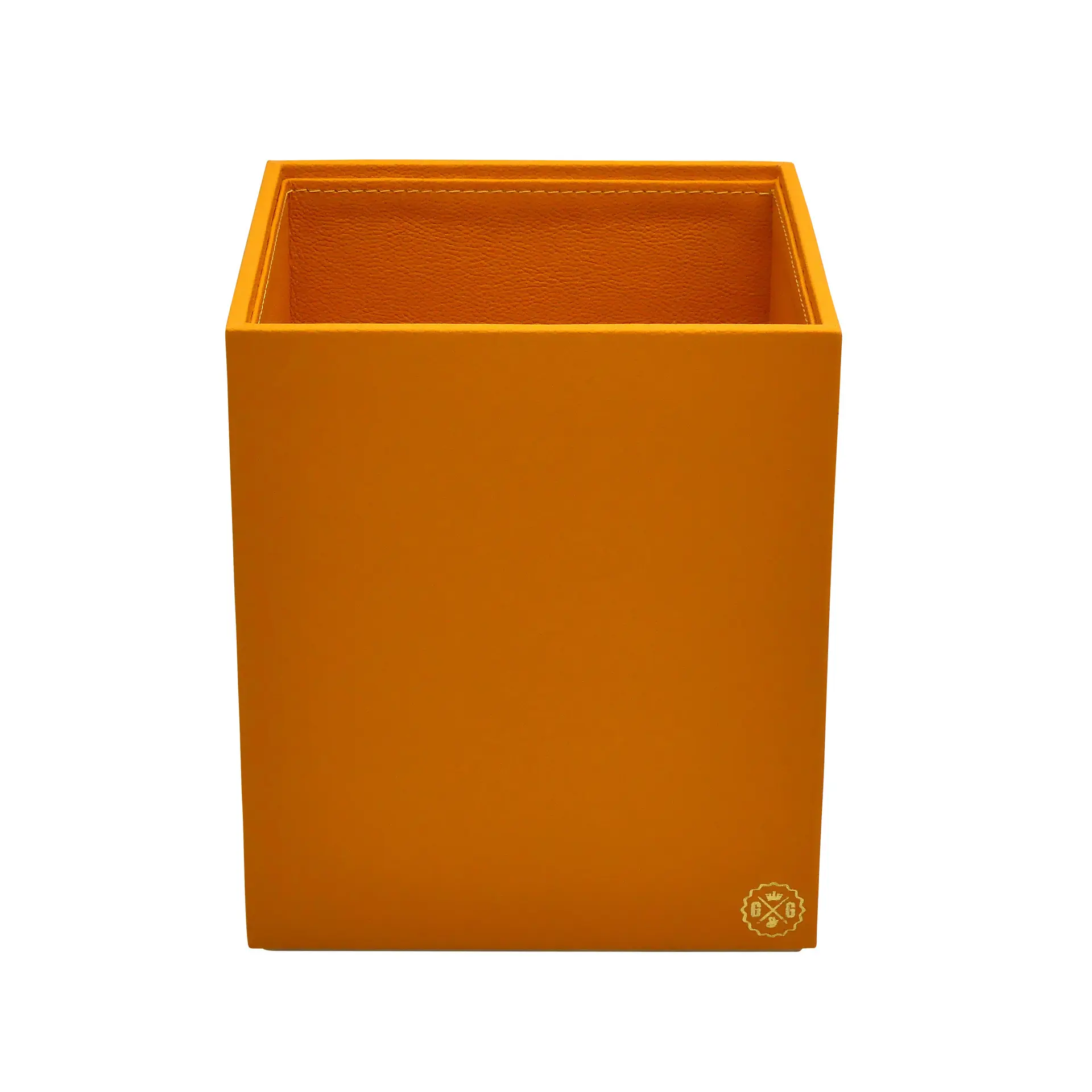 Elegant orange leather wastepaper basket, perfect for office decor.