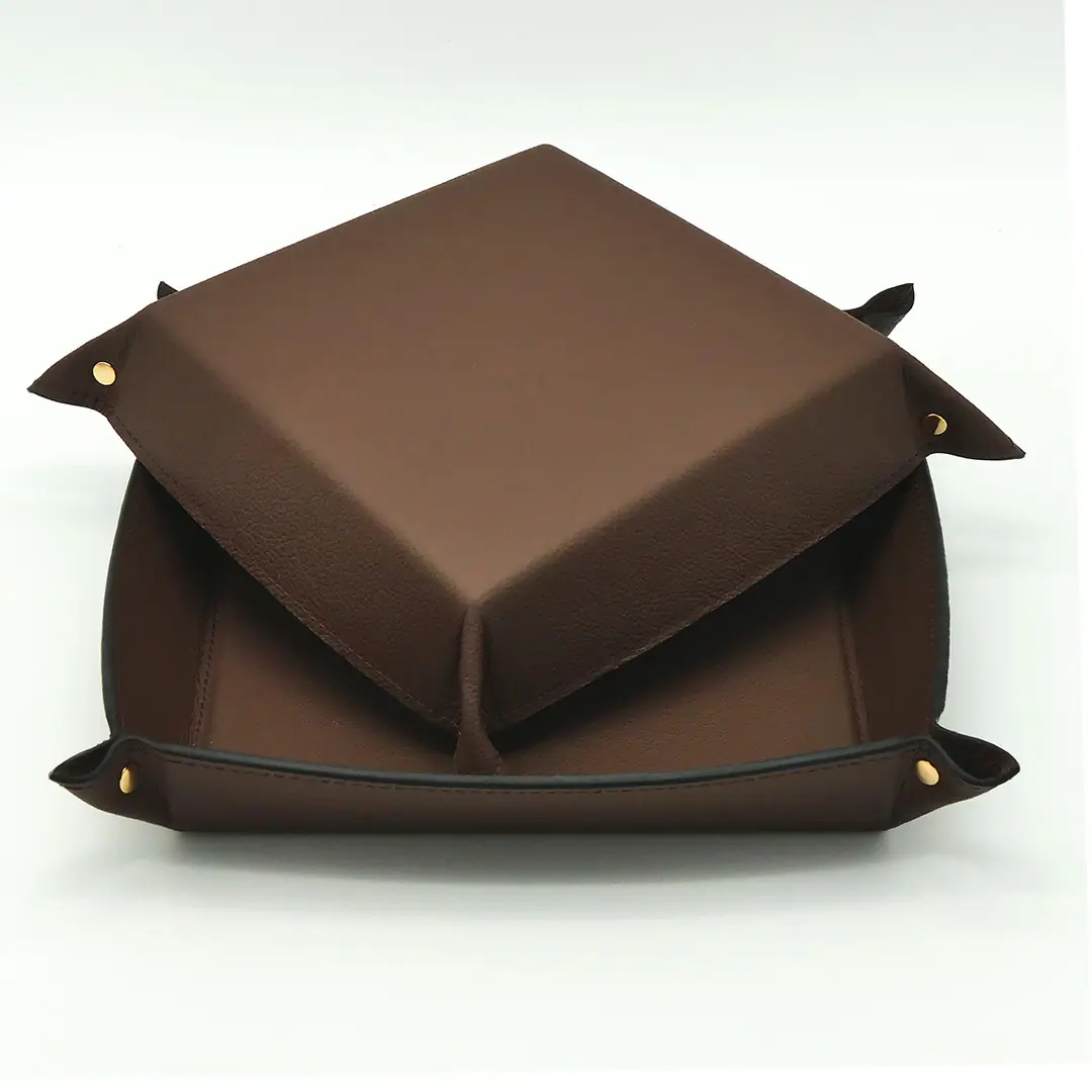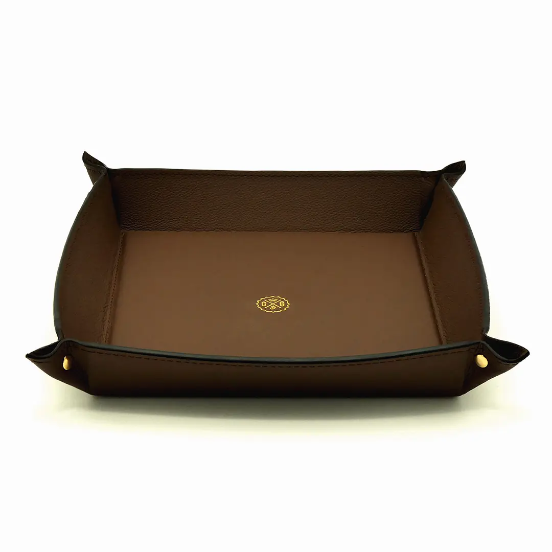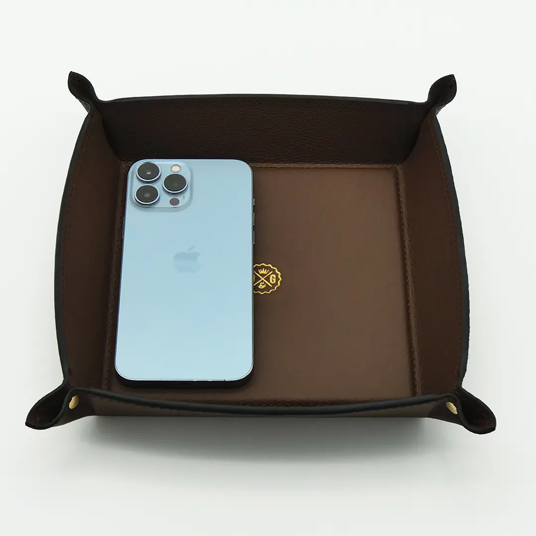 Stylish dark brown leather valet tray, perfect for organizing essentials on your yacht.